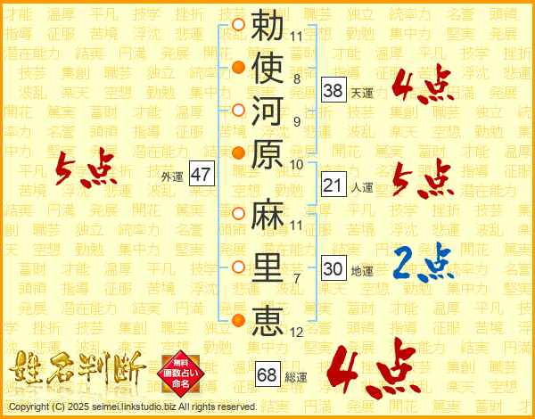 勅(11画)使(8画)河(9画)原(10画) 麻(11画)里(7画)恵(12画)