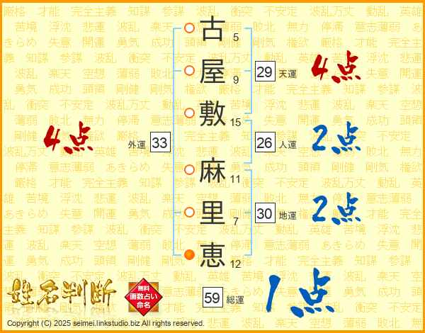 古(5画)屋(9画)敷(15画) 麻(11画)里(7画)恵(12画)