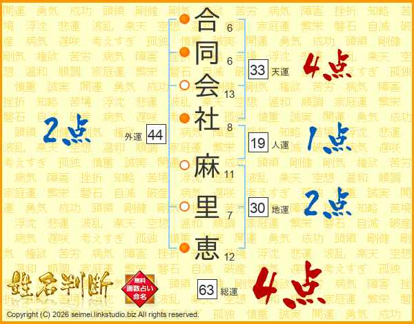 合(6画)同(6画)会(13画)社(8画) 麻(11画)里(7画)恵(12画)