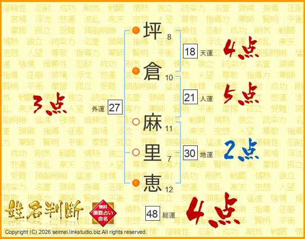 坪(8画)倉(10画) 麻(11画)里(7画)恵(12画)