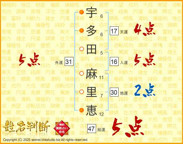 宇(6画)多(6画)田(5画) 麻(11画)里(7画)恵(12画)