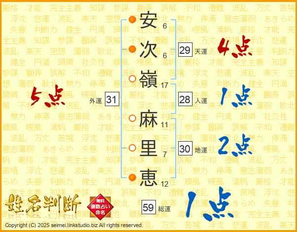 安(6画)次(6画)嶺(17画) 麻(11画)里(7画)恵(12画)