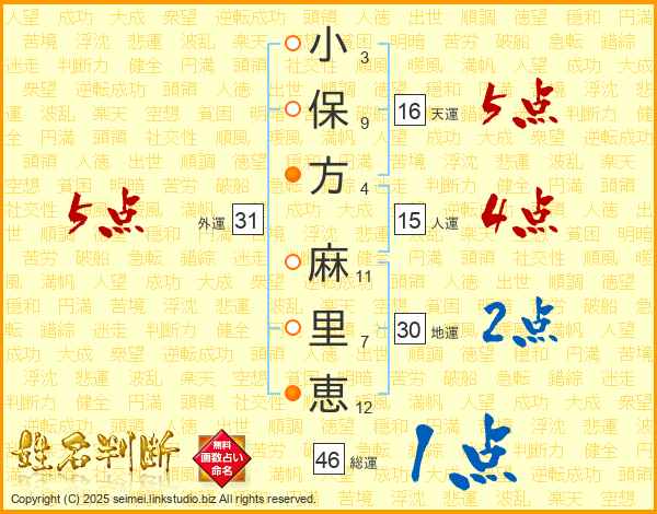 小(3画)保(9画)方(4画) 麻(11画)里(7画)恵(12画)