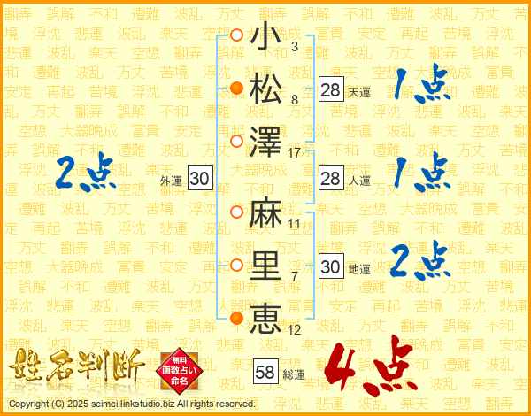小(3画)松(8画)澤(17画) 麻(11画)里(7画)恵(12画)