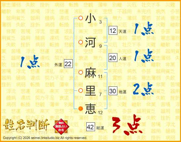 小(3画)河(9画) 麻(11画)里(7画)恵(12画)