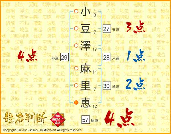 小(3画)豆(7画)澤(17画) 麻(11画)里(7画)恵(12画)
