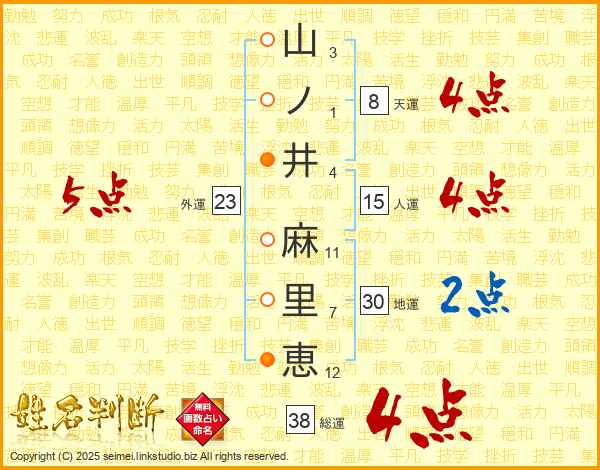 山(3画)ノ(1画)井(4画) 麻(11画)里(7画)恵(12画)