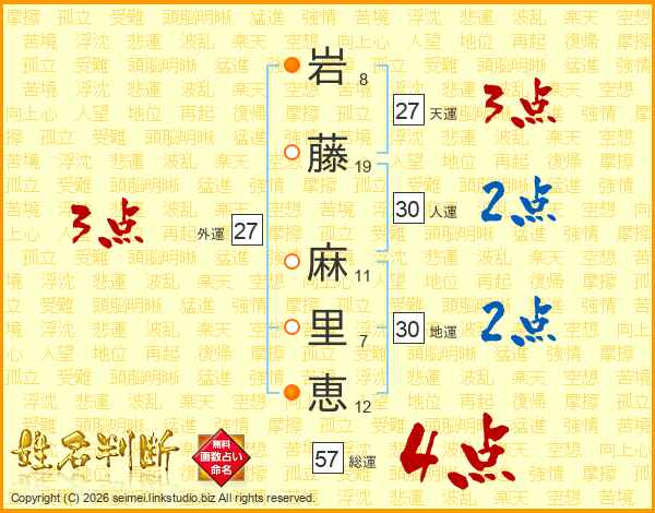 岩(8画)藤(19画) 麻(11画)里(7画)恵(12画)