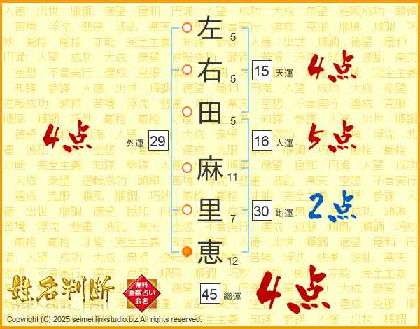左(5画)右(5画)田(5画) 麻(11画)里(7画)恵(12画)