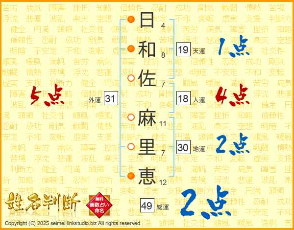 日(4画)和(8画)佐(7画) 麻(11画)里(7画)恵(12画)