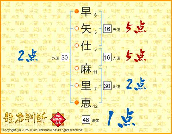 早(6画)矢(5画)仕(5画) 麻(11画)里(7画)恵(12画)