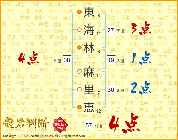 東(8画)海(11画)林(8画) 麻(11画)里(7画)恵(12画)