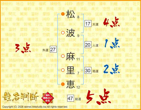 松(8画)波(9画) 麻(11画)里(7画)恵(12画)