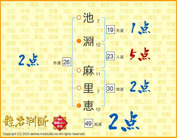池(7画)淵(12画) 麻(11画)里(7画)恵(12画)