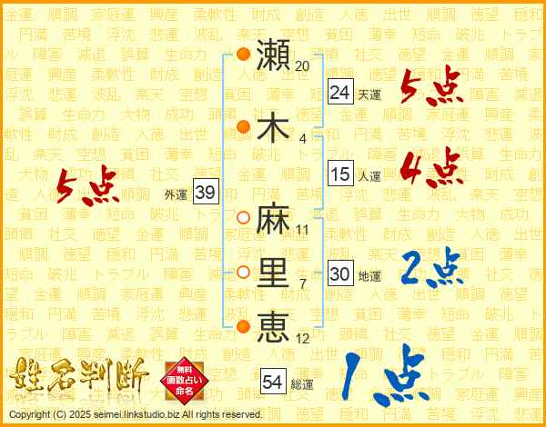 瀬(20画)木(4画) 麻(11画)里(7画)恵(12画)