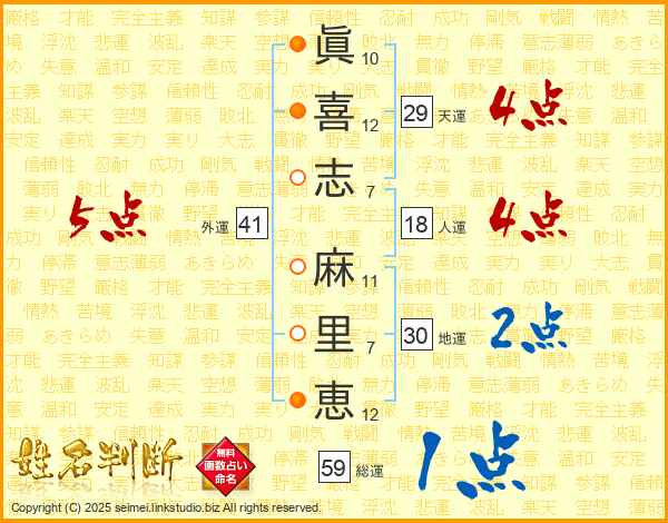眞(10画)喜(12画)志(7画) 麻(11画)里(7画)恵(12画)