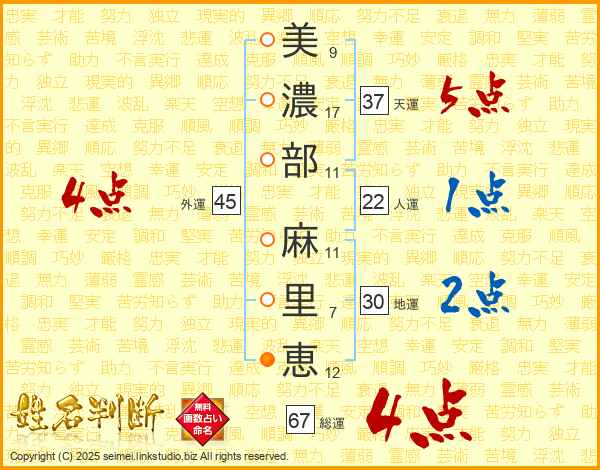 美(9画)濃(17画)部(11画) 麻(11画)里(7画)恵(12画)