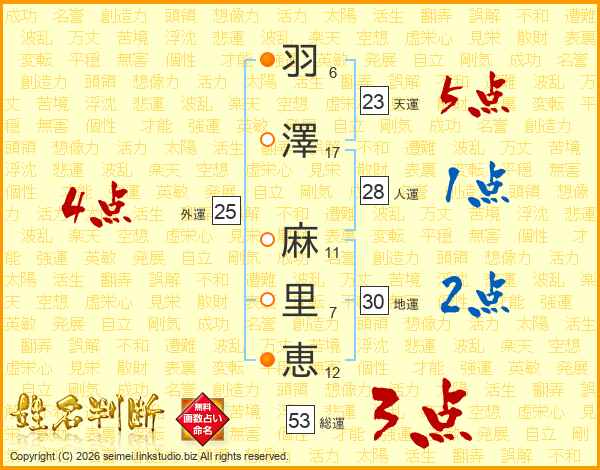 羽(6画)澤(17画) 麻(11画)里(7画)恵(12画)