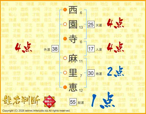 西園寺麻里恵さんの外運は38画の4点!
