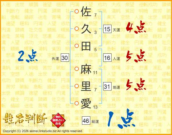 佐(7画)久(3画)田(5画) 麻(11画)里(7画)愛(13画)