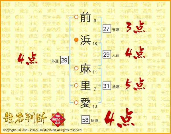 前(9画)浜(18画) 麻(11画)里(7画)愛(13画)