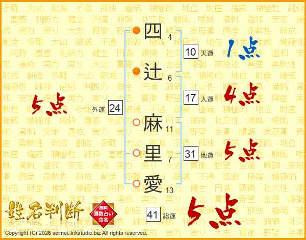 四(4画)辻(6画) 麻(11画)里(7画)愛(13画)