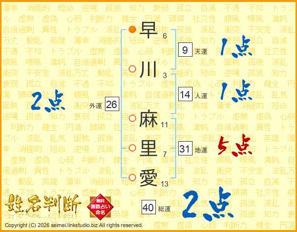早(6画)川(3画) 麻(11画)里(7画)愛(13画)