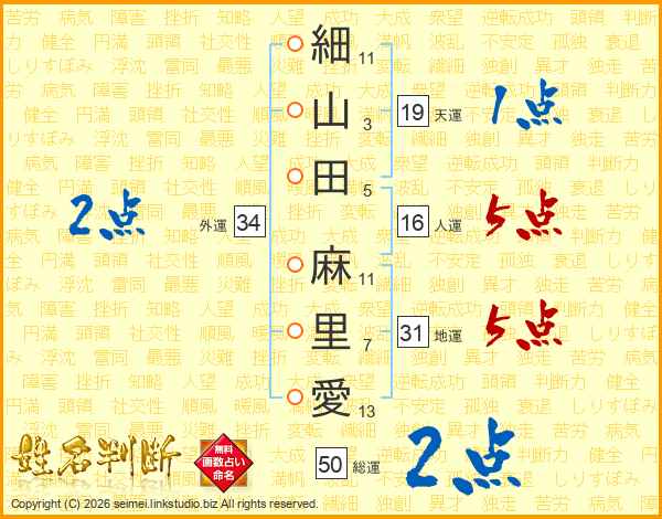 細山田麻里愛さんの地運は31画の5点!