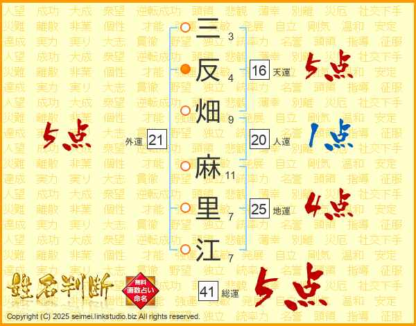 三(3画)反(4画)畑(9画) 麻(11画)里(7画)江(7画)