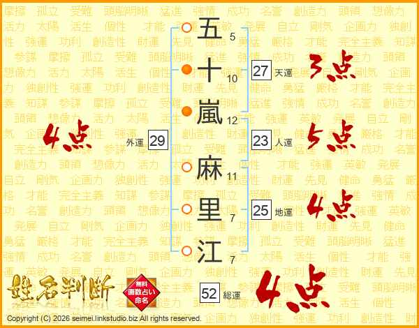 五(5画)十(10画)嵐(12画) 麻(11画)里(7画)江(7画)