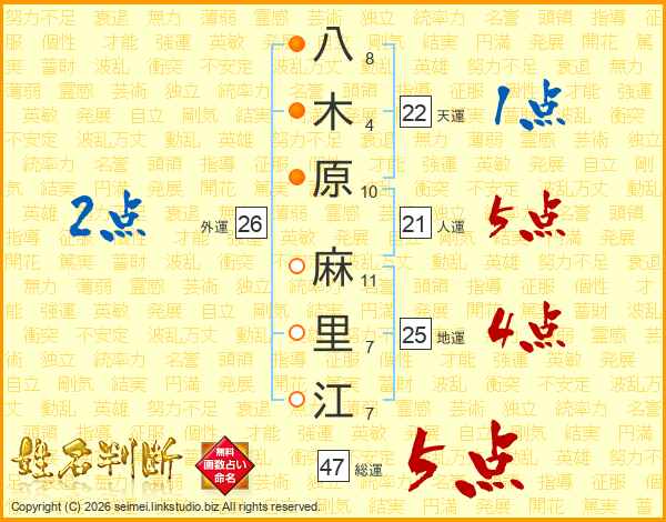 八(8画)木(4画)原(10画) 麻(11画)里(7画)江(7画)