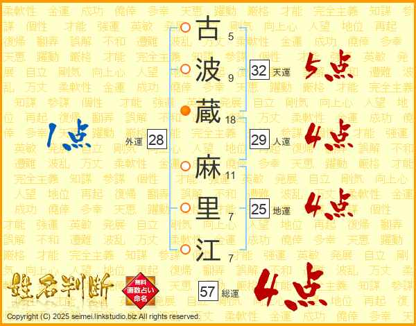 古(5画)波(9画)蔵(18画) 麻(11画)里(7画)江(7画)