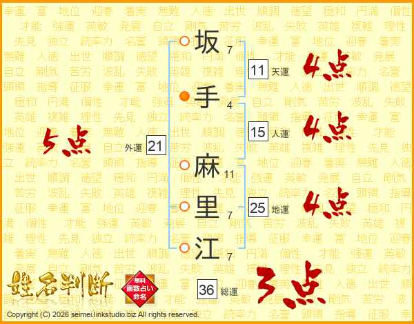 坂(7画)手(4画) 麻(11画)里(7画)江(7画)