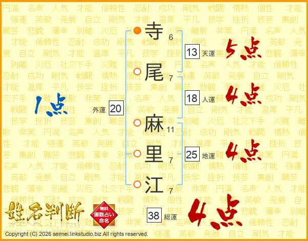 寺(6画)尾(7画) 麻(11画)里(7画)江(7画)