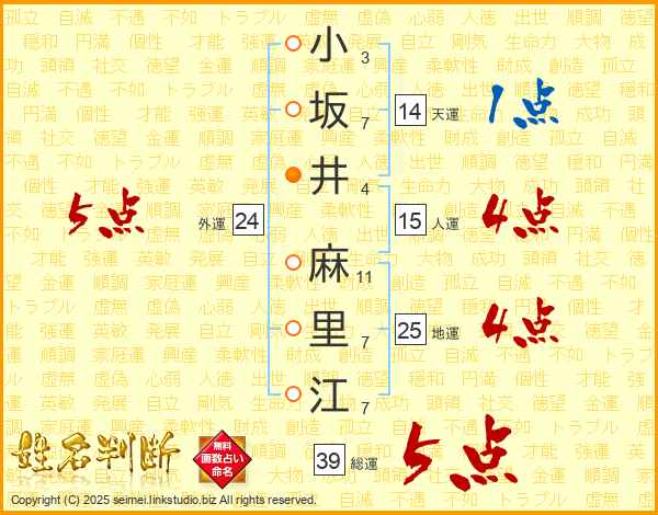 小(3画)坂(7画)井(4画) 麻(11画)里(7画)江(7画)