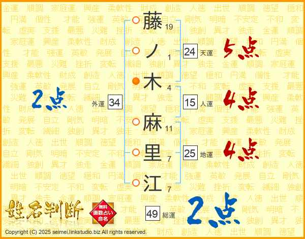 藤(19画)ノ(1画)木(4画) 麻(11画)里(7画)江(7画)