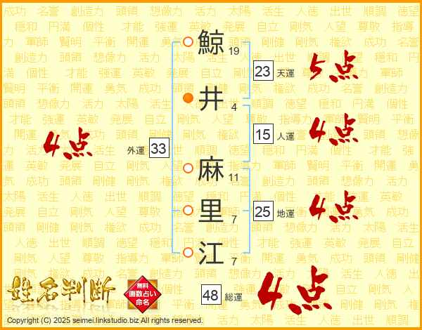 鯨(19画)井(4画) 麻(11画)里(7画)江(7画)