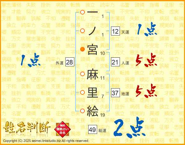 一(1画)ノ(1画)宮(10画) 麻(11画)里(7画)絵(19画)