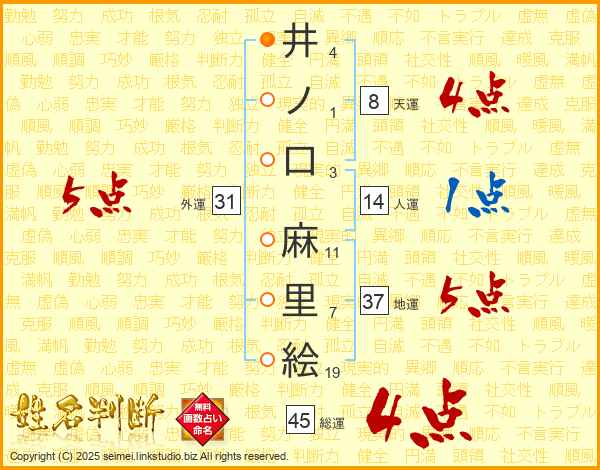 井(4画)ノ(1画)口(3画) 麻(11画)里(7画)絵(19画)