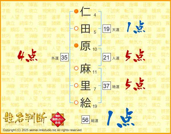 仁(4画)田(5画)原(10画) 麻(11画)里(7画)絵(19画)