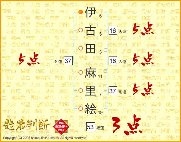 伊(6画)古(5画)田(5画) 麻(11画)里(7画)絵(19画)