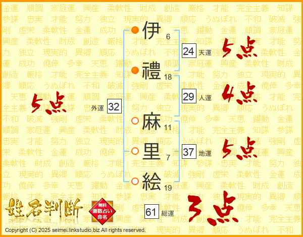 伊(6画)禮(18画) 麻(11画)里(7画)絵(19画)