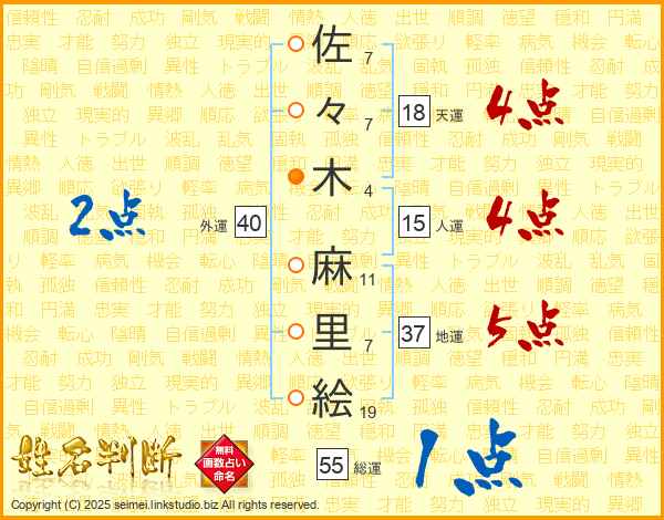 佐(7画)々(7画)木(4画) 麻(11画)里(7画)絵(19画)