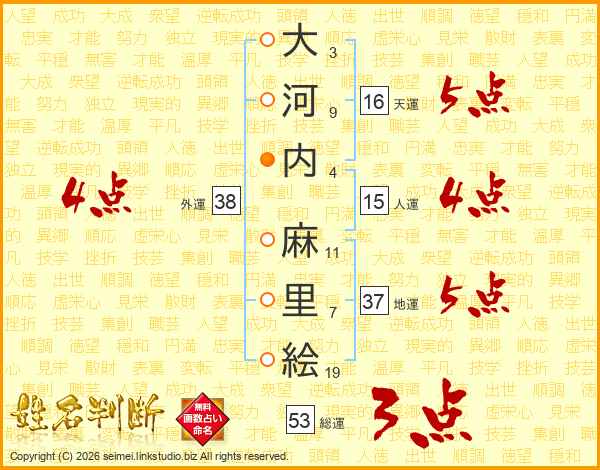 大(3画)河(9画)内(4画) 麻(11画)里(7画)絵(19画)