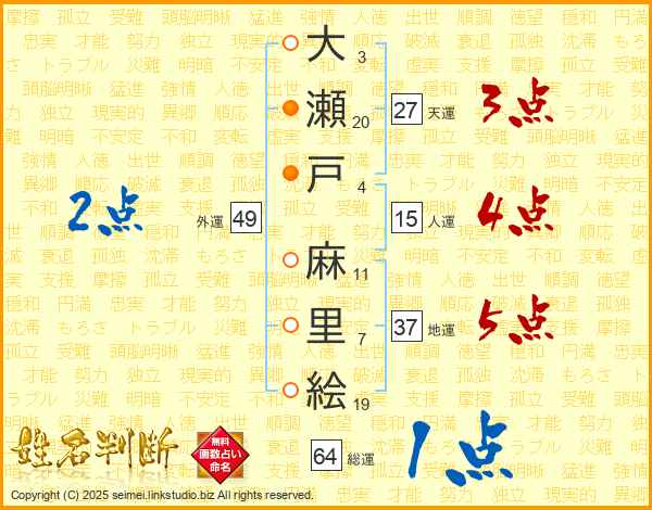 大瀬戸麻里絵さんの地運は37画の5点!