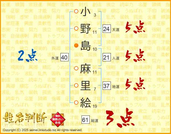 小(3画)野(11画)島(10画) 麻(11画)里(7画)絵(19画)
