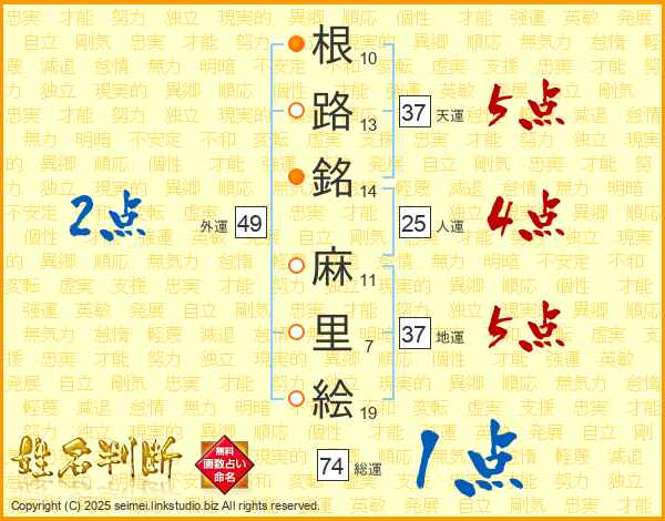 根(10画)路(13画)銘(14画) 麻(11画)里(7画)絵(19画)