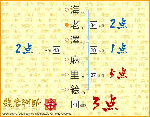 海(11画)老(6画)澤(17画) 麻(11画)里(7画)絵(19画)