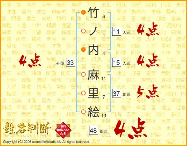 竹(6画)ノ(1画)内(4画) 麻(11画)里(7画)絵(19画)