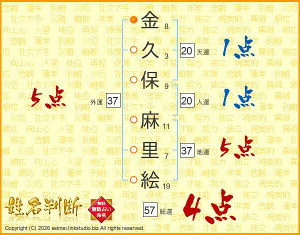 金(8画)久(3画)保(9画) 麻(11画)里(7画)絵(19画)